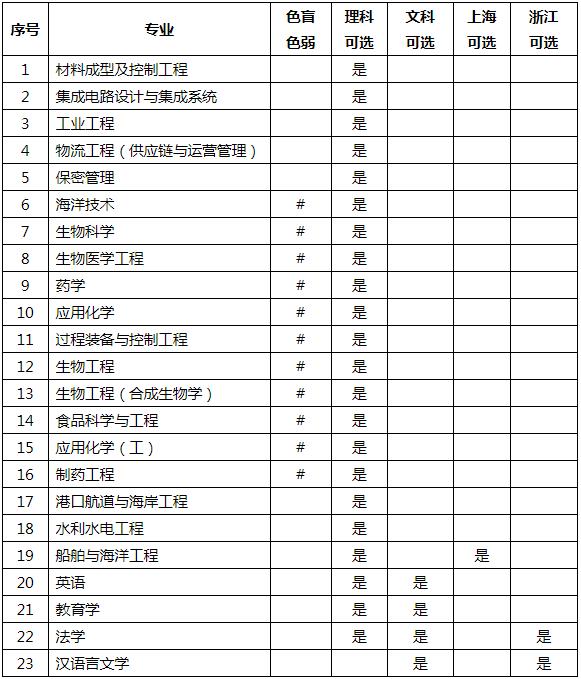 注:标记“#”的专业表示不招收患有色盲、色弱的考生;生物医学工程专业建议考生视力(近视眼)不超过800度。