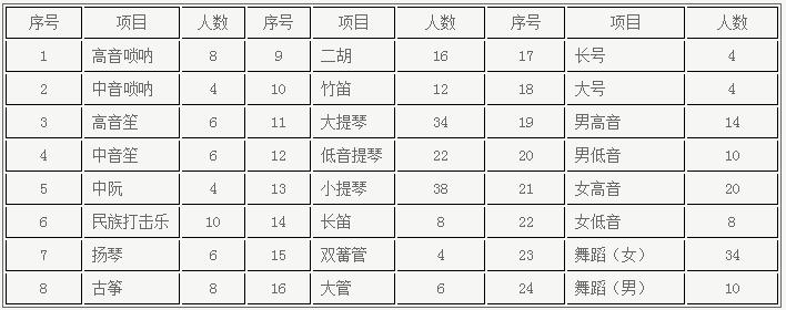 2018年高水平艺术团招收项目:高音唢呐、中音唢呐、高音笙、中音笙、中阮、民族打击乐、扬琴、古筝、二胡、竹笛、大提琴、低音提琴、小提琴、长笛、双簧管、大管、长号、大号、男高音、男低音、女高音、女低音、舞蹈(男、女)。