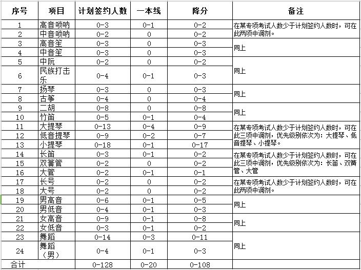 2018年高水平艺术团招生计划人数:64人,按教育部规定签约128人,根据第二轮艺术专项考试成绩,各专项招生计划签约人数(参见表2)。