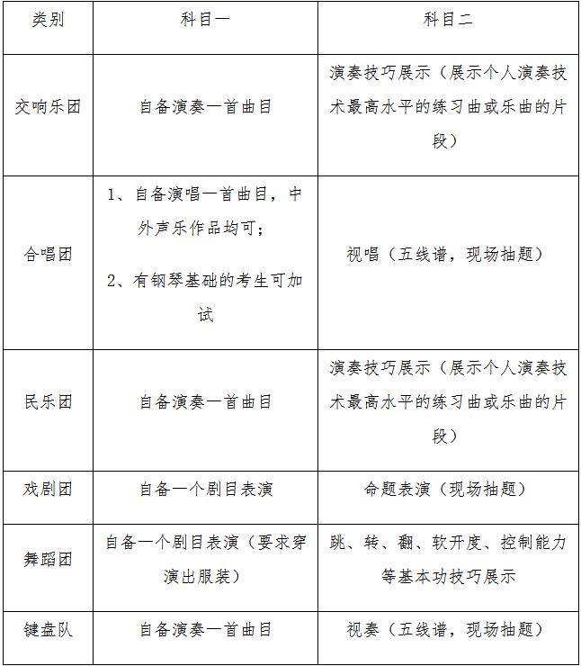 注:1. 考试须背谱(视奏、视唱除外),作品可与初试作品相同或不同;交响乐团和民乐团科目一演奏曲目与科目二演奏曲目须不同。