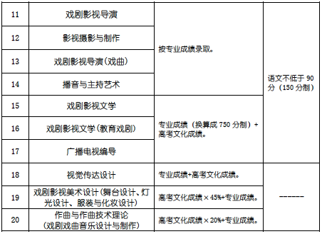 以上各专业(方向)高考文化成绩达到所在省市普通类本科第一批次分数线者优先录取。各专业(方向)任一单科不得缺考或零分。其中:表演(戏剧影视、音乐剧)、舞蹈表演、戏剧影视导演、戏剧影视导演(戏曲)、播音与主持艺术专业按专业成绩分男女考生分别排序。