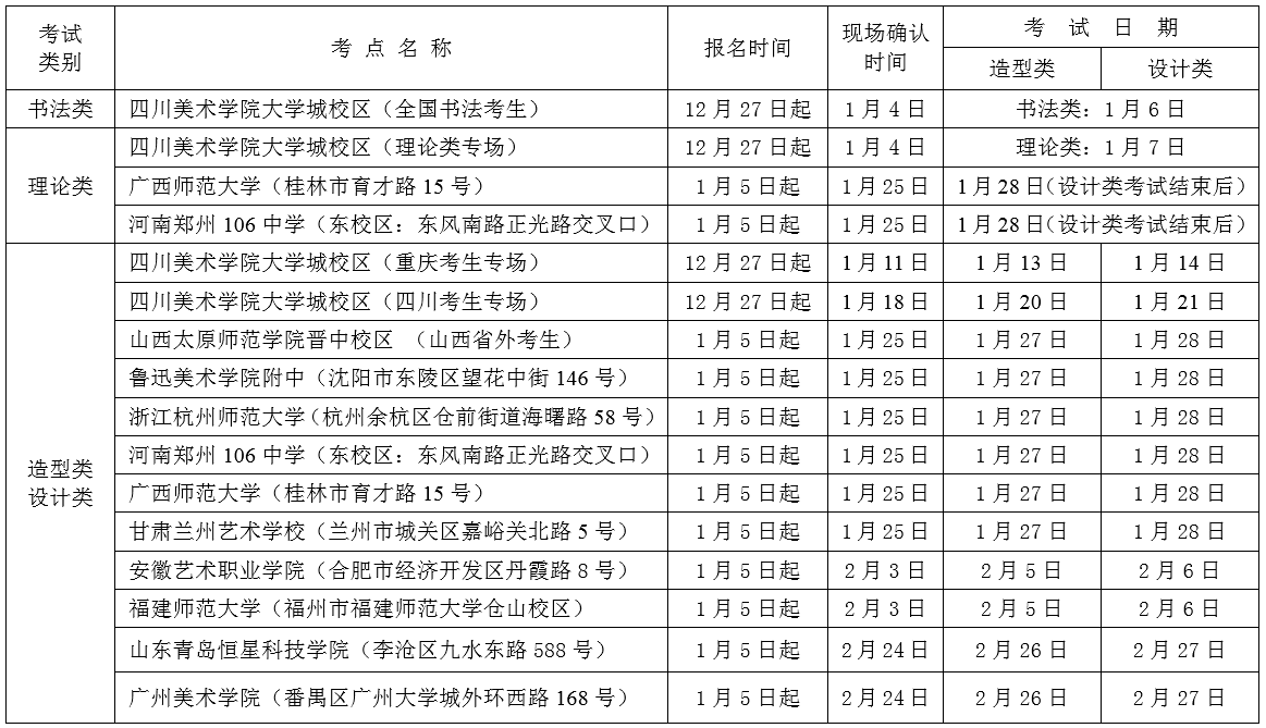 ③本省未设考点的省市,如:北京、天津、内蒙、吉林、黑龙江、上海、海南、西藏、陕西、青海、宁夏、新疆、港澳台考生,报考造型类和设计类可参加重庆(1月13、14日)、太原、沈阳、杭州、福州、桂林或兰州考点组织的专业考试。
