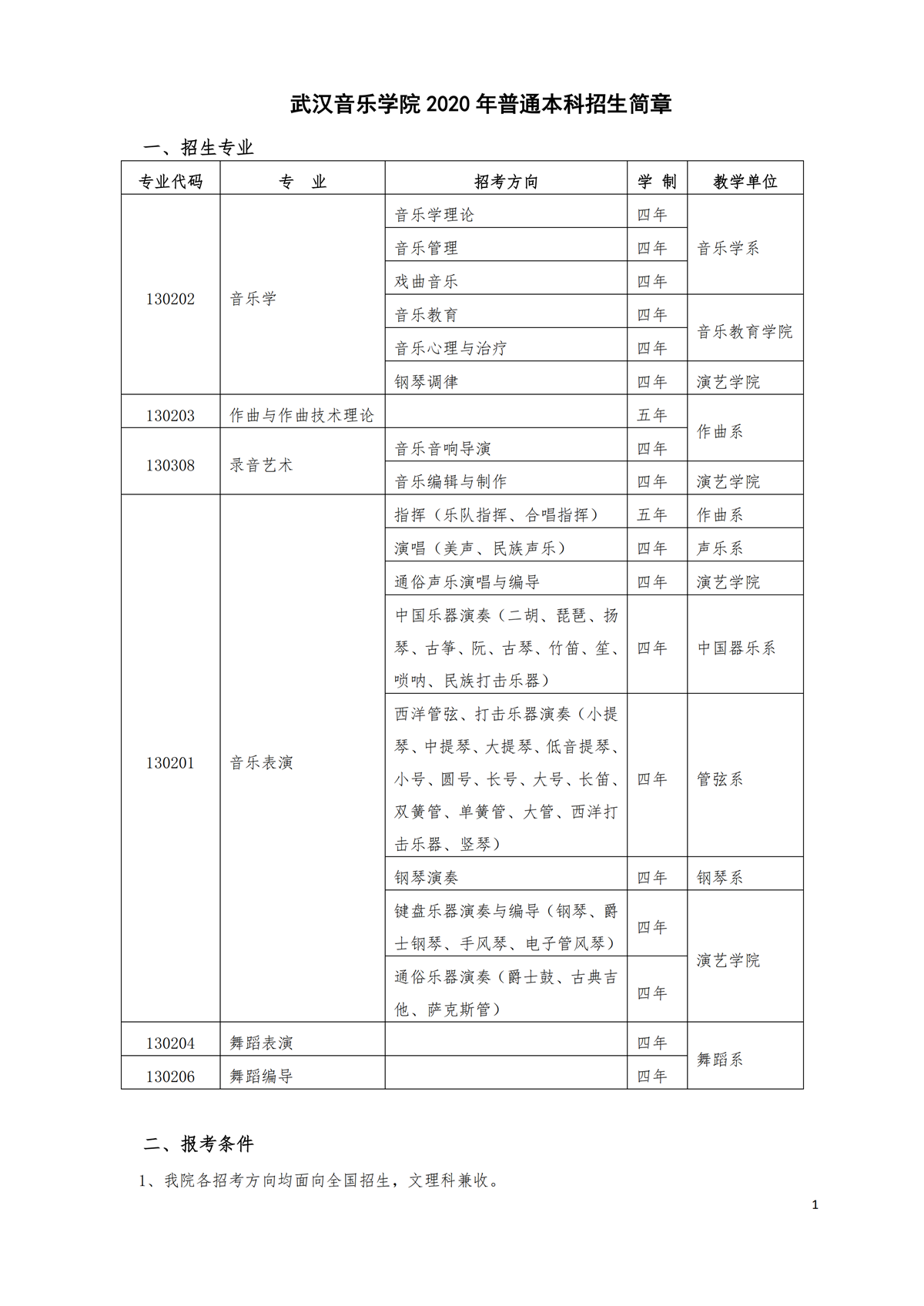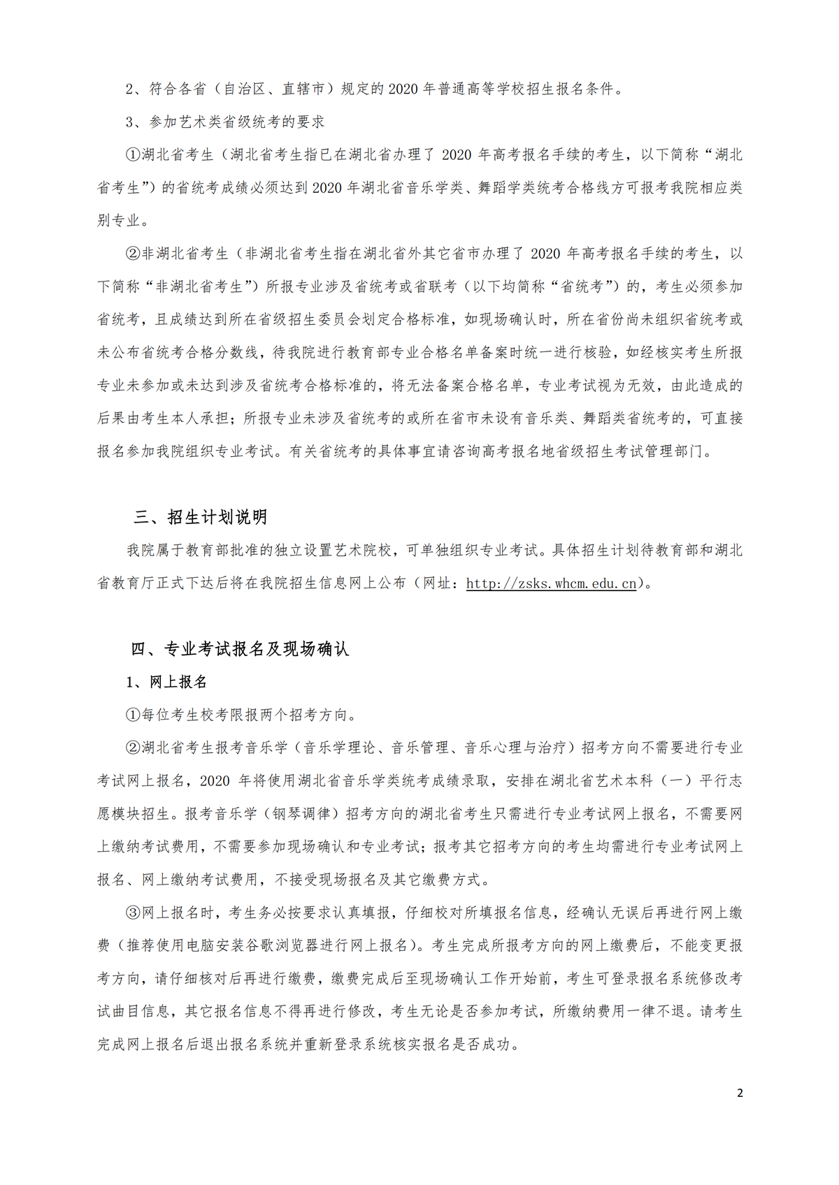 武汉音乐学院2020年普通本科招生简章