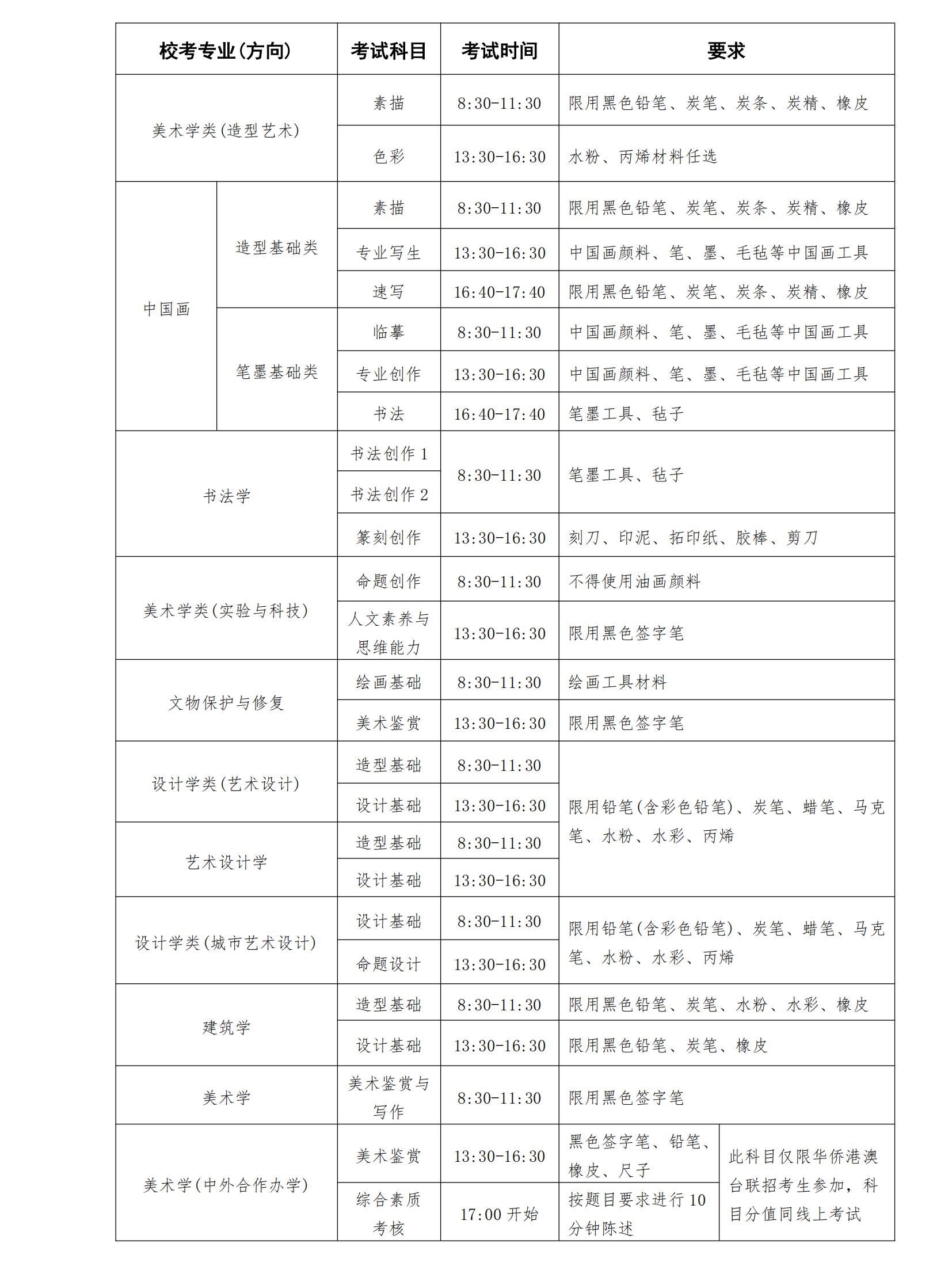 (1)美术学类(造型艺术)、中国画、书法学、美术学类(实验与科技)、设计学类(艺术设计)、设计学类(城市艺术设计)、文物保护与修复专业考生文化课成绩不低于考生所在省(区、市)普通类专业本科批次相应科类录取控制分数线。