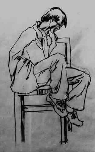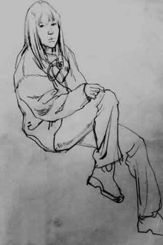 第一张试卷,是坐着的女人,本张试卷属于60分上下的作品。人体速写最重要的五部分都有一定的表现(五官、头、手、足、四肢。)而且就表现上来说五官、四肢头还算准确。只是线条应用的有些拖沓,手部和脚部的结构关系理解的不到位,表现的也不够。衣褶的处理有些概念化。模特的动态处理的还算过关。所以我们说人体解剖学是绘画很重要的学科。