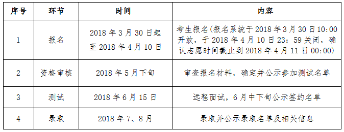 报名时间为2018年3月30日 - 2018年4月10日。报名系统于2018年3月30日10:00开放,于2018年4月10日23:59关闭,确认志愿时间截止到2018年4月11日00:00,未确认志愿的考生报名无效。