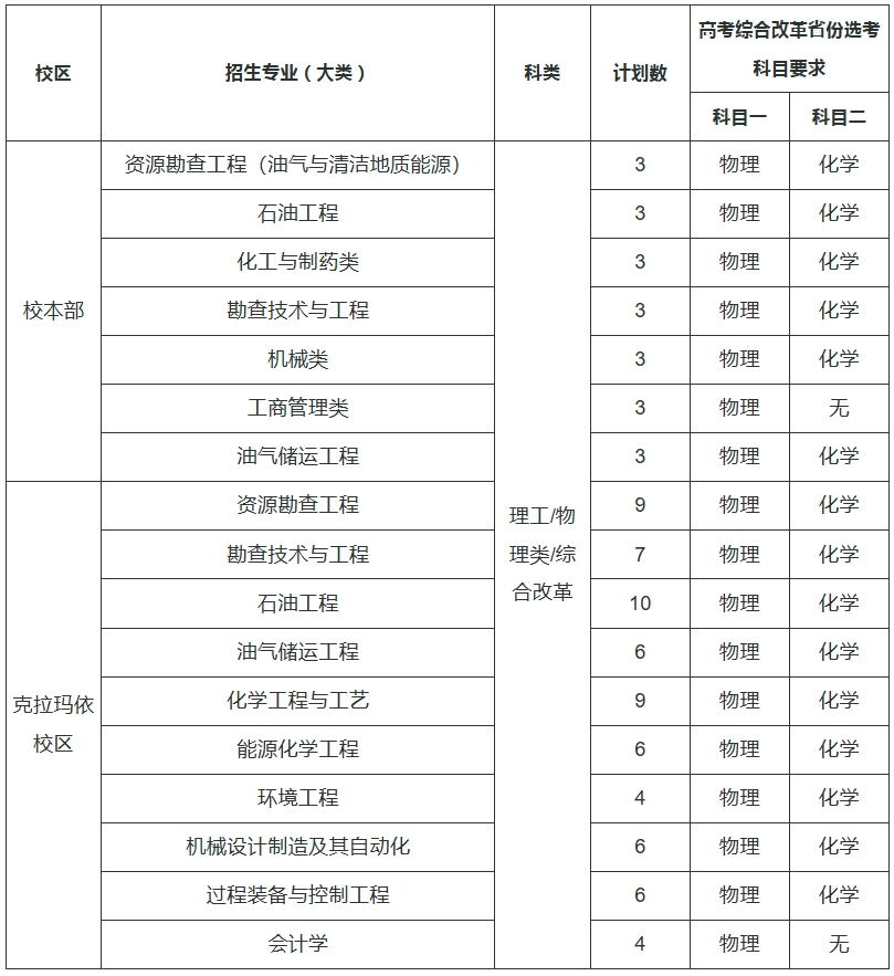面向全国实施高校专项计划的省份招生。校本部与克拉玛依校区各自单独报名、初审、公示入围资格名单,且结果不能互认。高考后各自单独录取,互不调剂。