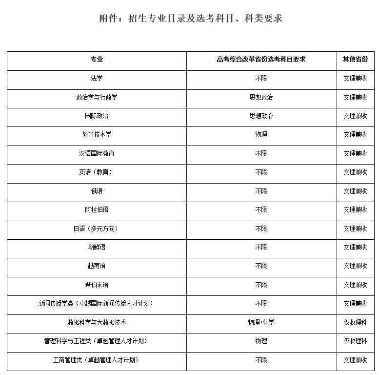 1.工商管理类(卓越管理人才计划)含工商管理、财务管理、市场营销、公共关系学4个专业;管理科学与工程类(卓越管理人才计划)含信息管理与信息系统、大数据管理与应用2个专业;新闻传播学类(卓越国际新闻传播人才计划)含新闻学(国际新闻)、国际新闻与传播、广告学、广播电视学、网络与新媒体5个专业;日语(多元方向)含日语、日语(工商管理双学位)2个专业;