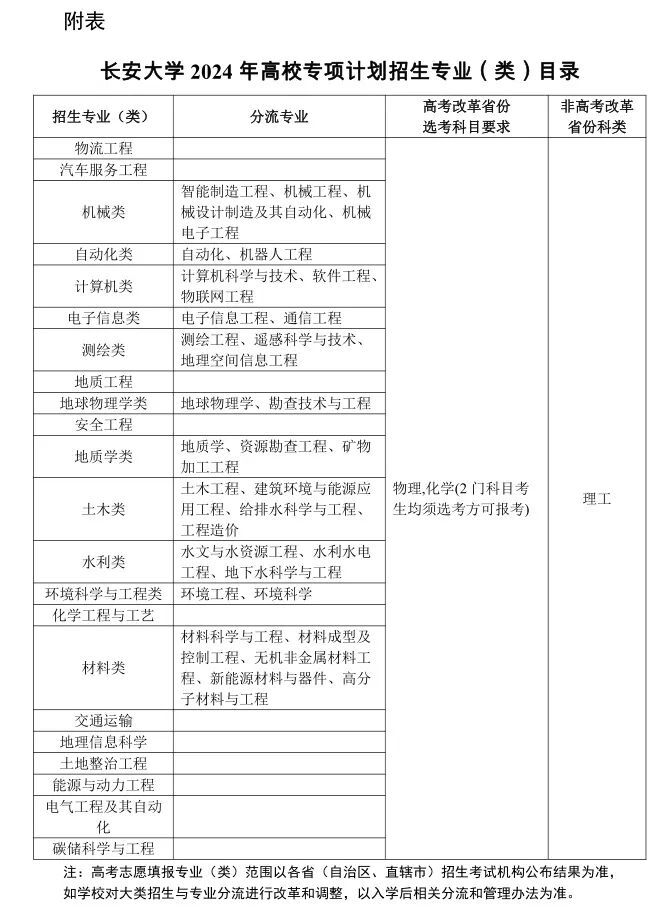 附表:长安大学2024年高校专项计划招生专业(类)目录