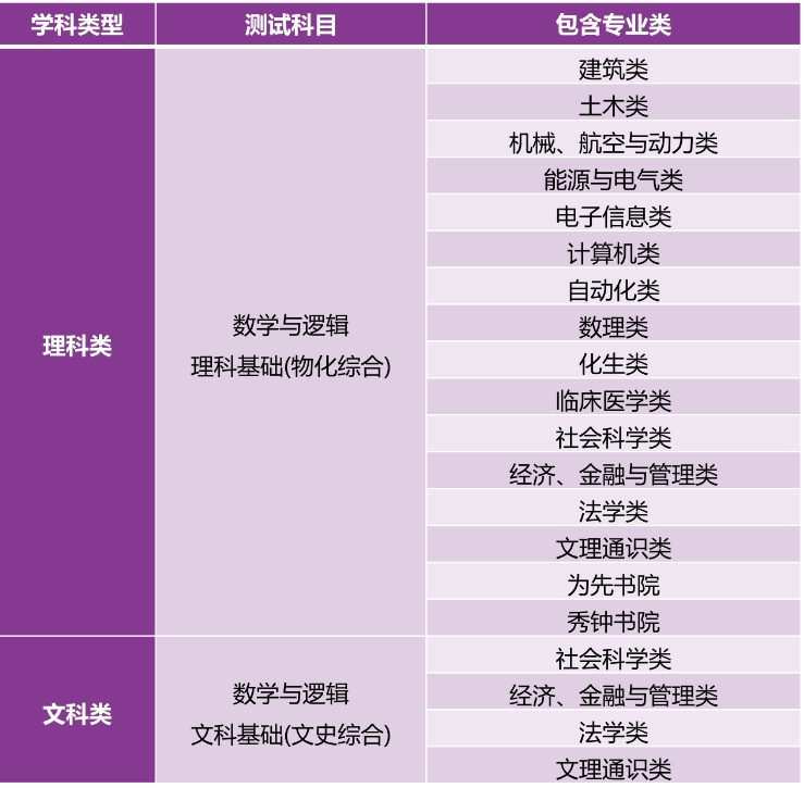 2024年我校自强计划录取人数不低于教育部规定的高校专项计划招生规模。各学科类型及对应的初试测试科目和专业类(专业类名称以高考填报志愿系统公布为准)如下: