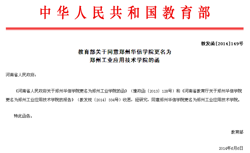 教育部关于同意郑州华信学院更名为郑州工业应用技术学院的函