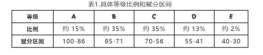 1.等级换算对应关系。各等级及其所占人数比例、等级分赋分区间对应关系如下表所示。