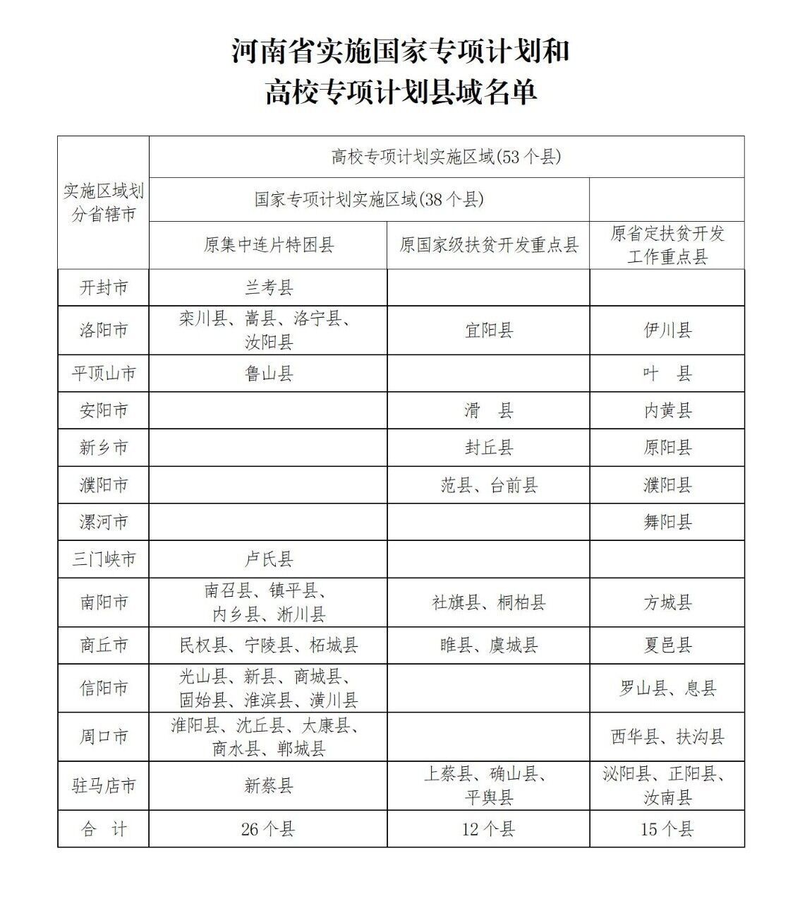 国家专项计划的实施区域为国家划定的38个县(包括26个原集中连片特殊困难县和12个原国家级扶贫开发重点县)。考生须同时具备下列条件:本人具有实施区域当地连续3年以上(至今)户籍,其父亲或母亲或法定监护人具有当地户籍;本人具有户籍所在县高中连续3年学籍并实际就读;已在当地参加2024年统一高考报名且通过报名资格审核。