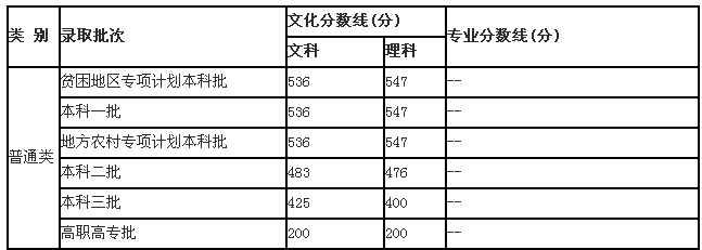 2011年河南省普通高校招生录取控制分数线(如下图)