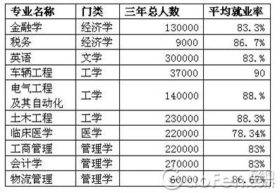 不管哪个版本的“热门专业”,最重要的是这些专业的就业率。到底“热门专业”的就业情况如何,还是让数据来说明吧!下面将新浪、搜狐与麦可思网站中统计到的最受关注专业以“取每个排行第一名”“各排行榜重合度最高”的标准统计出这十个专业:金融学、税务、英语、车辆工程、电气工程及其自动化、土木工程、临床医学、工商管理、会计学与物流管理。