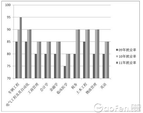 各专业就业统计图中显示各专业近三年毕业人数都是稳定有增,没有出现人数下滑的趋势,可以说这几个专业在近几年一直处于稳步发展的状态,结合它们近三年不断上升的就业率来看,这些专业仍然存在市场需求量。需要提醒考生和家长注意的是,需求量也因专业而异,比如车辆工程专业,三年的就业呈上升趋势,而且毕业人数从2009年的8000人增加到2011年的20000人,这说明该专业的社会需求量较大。而英语、物流管理等专业三年毕业人数未发生变化,而近两年就业率持平,说明这两个专业目前就业比较平衡。