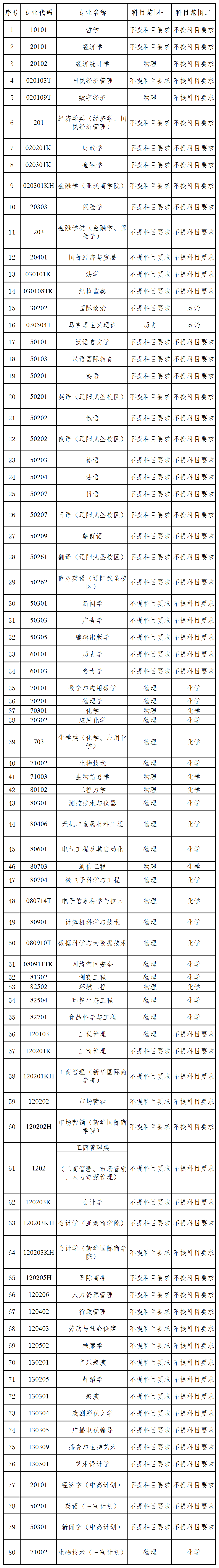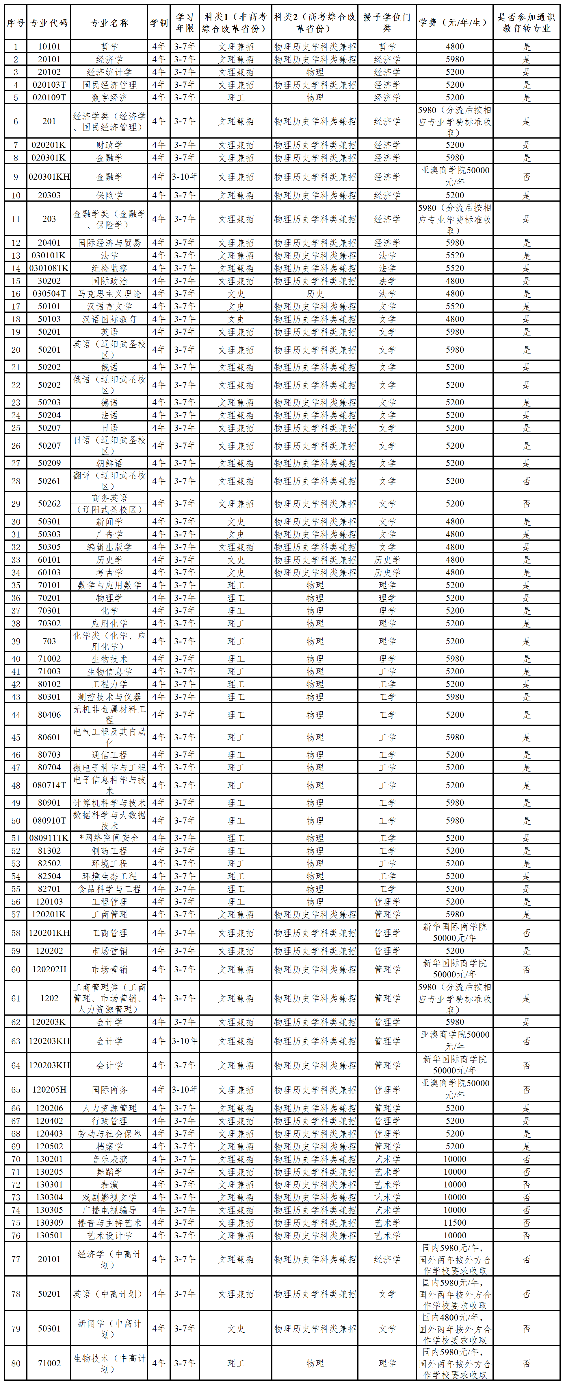 注:*新增专业学费标准以相关部门批复为准。外国语学院(辽阳武圣校区)、中高计划(包括经济学、英语、新闻学、生物技术专业)、授予学位门类为“艺术类”的相关专业学生不参与通识教育转专业。中外合作办学单位(亚澳商学院、新华国际商学院)转专业按照相关政策执行,不参与通识教育转专业。国家有相关规定或者录取前与学校有明确约定的,不参与通识教育转专业。