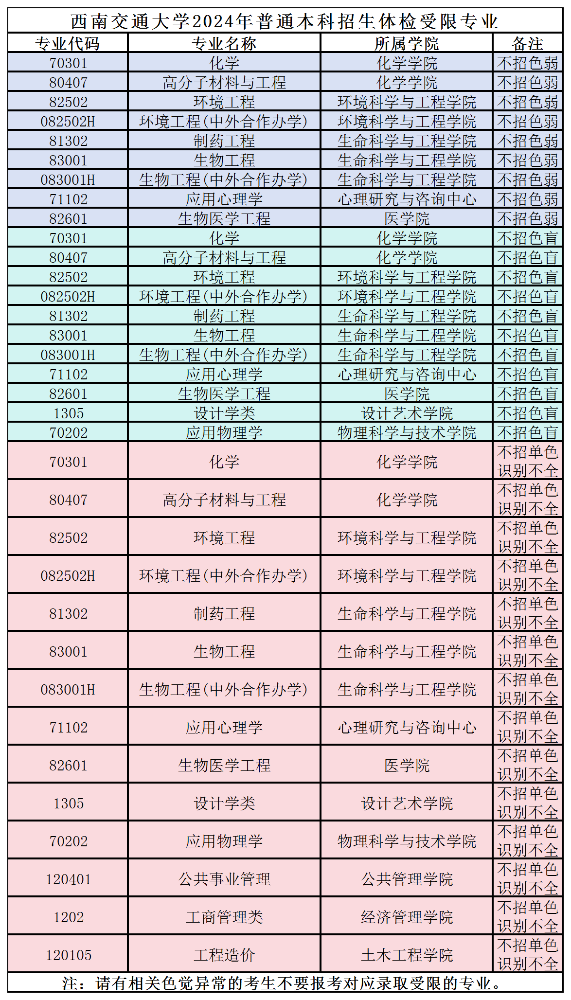 第十六条 对于考生身体健康状况的要求,学校执行教育部、原卫生部、中国残联印发的《普通高等学校招生体检工作指导意见》(教学〔2003〕3号)及有关补充规定,录取受限专业见附件。因用人单位在录用毕业生时要求毕业生不得有色觉功能异常,请色盲、色弱考生慎重报考以下专业:车辆工程、交通运输类、安全工程、轨道交通信号与控制、自动化、建筑学、建筑类。