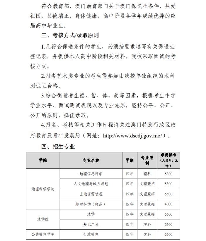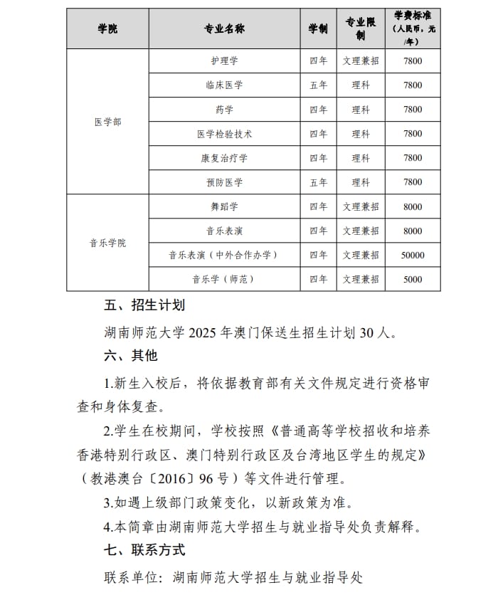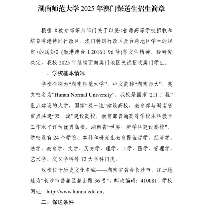 湖南师范大学2025 年澳门保送生招生简章