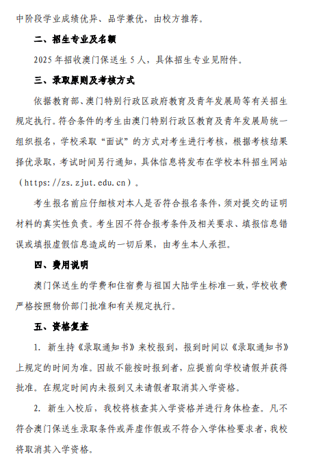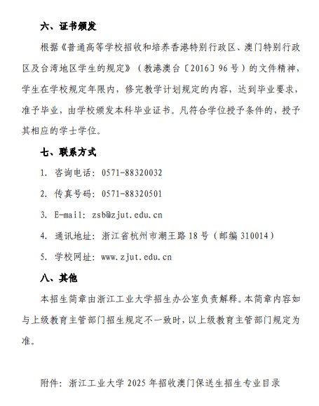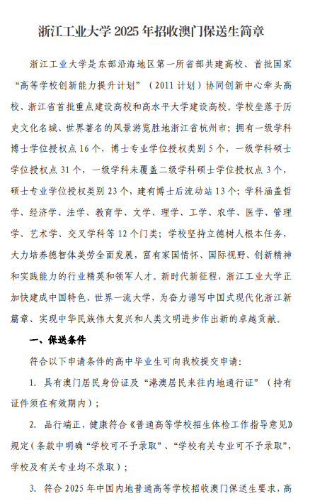 浙江工业大学2025年招收澳门保送生简章