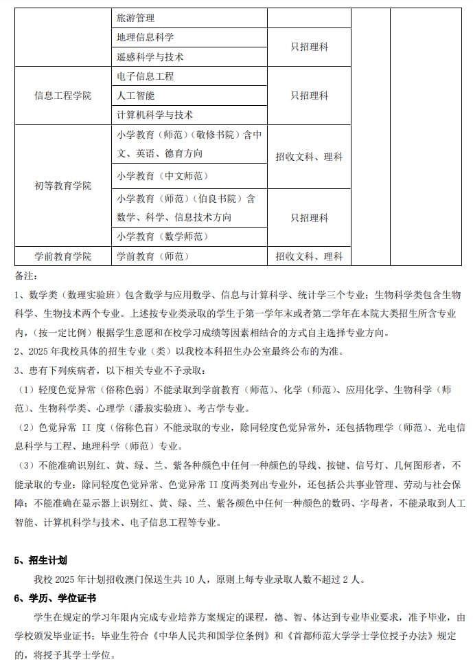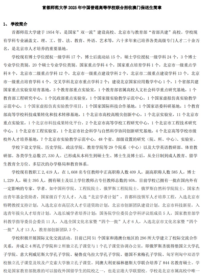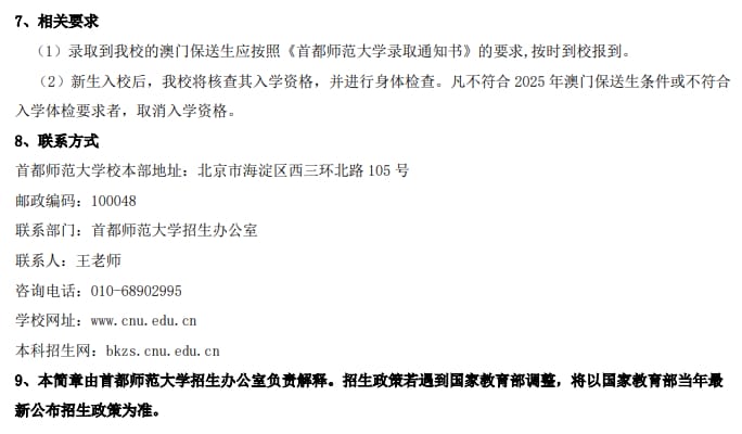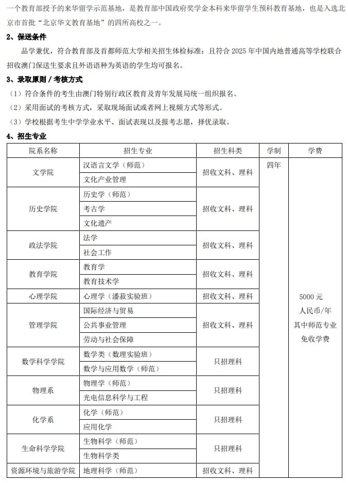 首都师范大学2025年中国普通高等学校联合招收澳门保送生简章