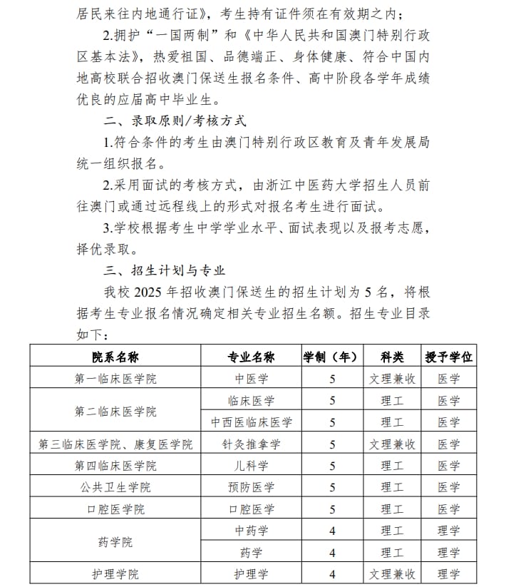 浙江中医药大学2025 年招收澳门保送生招生简章