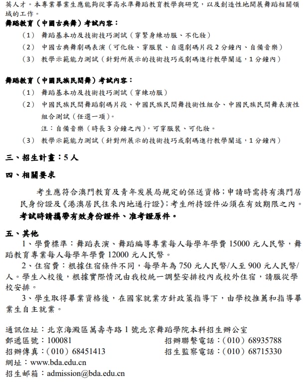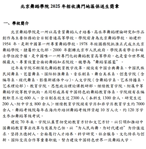 北京舞蹈学院2025年招收澳门地区保送生简章