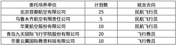 委托培养单位包括北京首都航空有限公司(计划投放省份:山东省、江苏省、湖南省)、乌鲁木齐航空有限责任公司(计划投放省份:河南省、河北省)、华夏航空股份有限公司(计划投放省份:山东省、江苏省、湖南省、河南省)、青岛九天国际飞行学院股份有限公司(山东省、江苏省、湖南省、河南省、河北)、华夏云翼国际教育科技有限公司(山东省、湖南省、河南省、河北)。