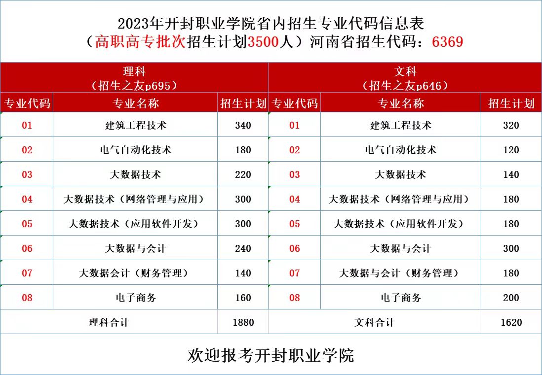 开封职业学院2023年招生计划