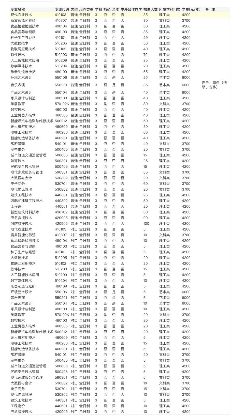 备注:以上专业均面向河南省招生,其中人工智能技术应用、新能源汽车检测与维修技术、乐器制造与维护专业同时面向河北省招生,智能制造装备技术、应急救援技术专业同时面向山东省招生。