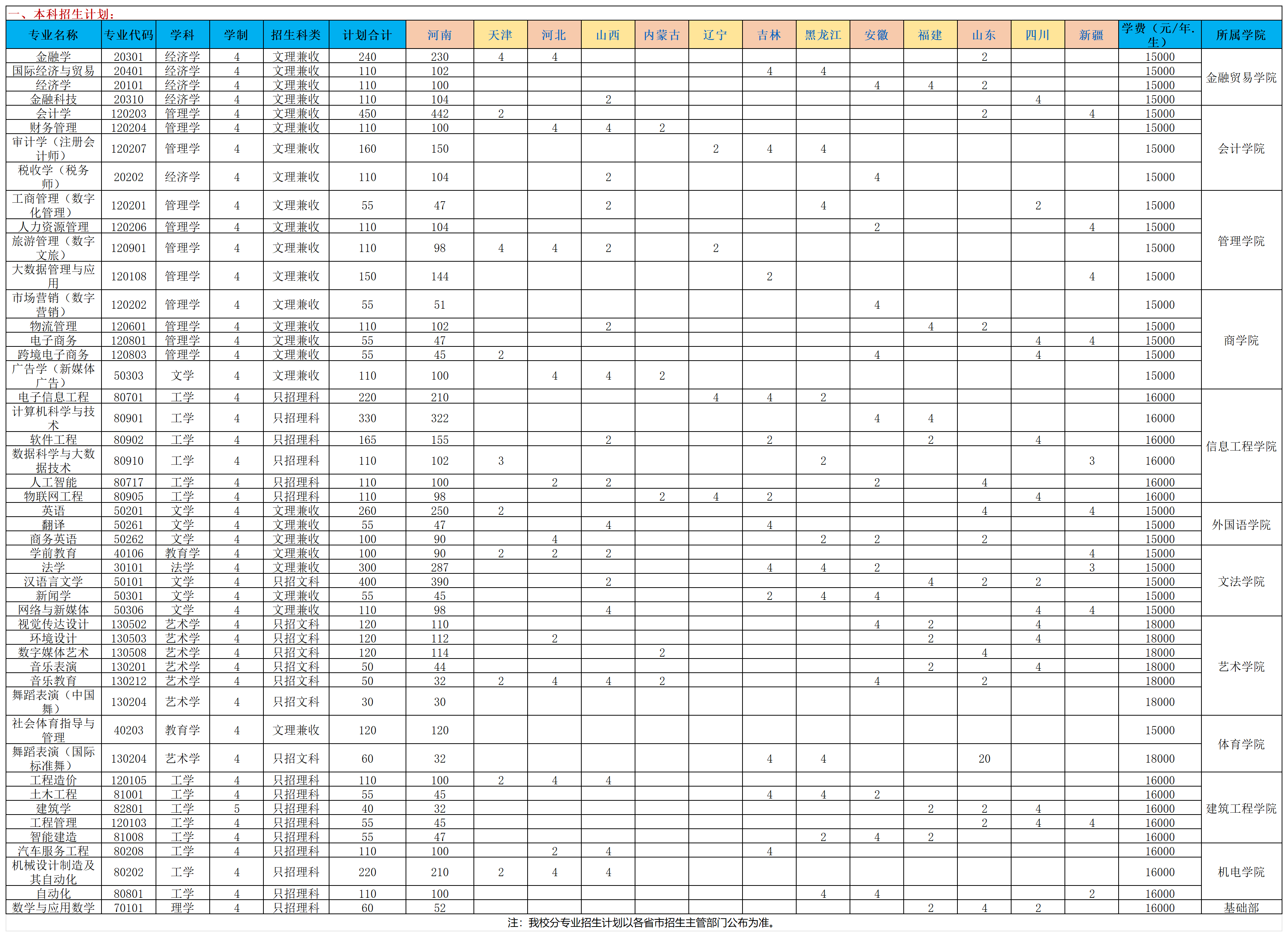 郑州升达经贸管理学院2024年本专科招生计划