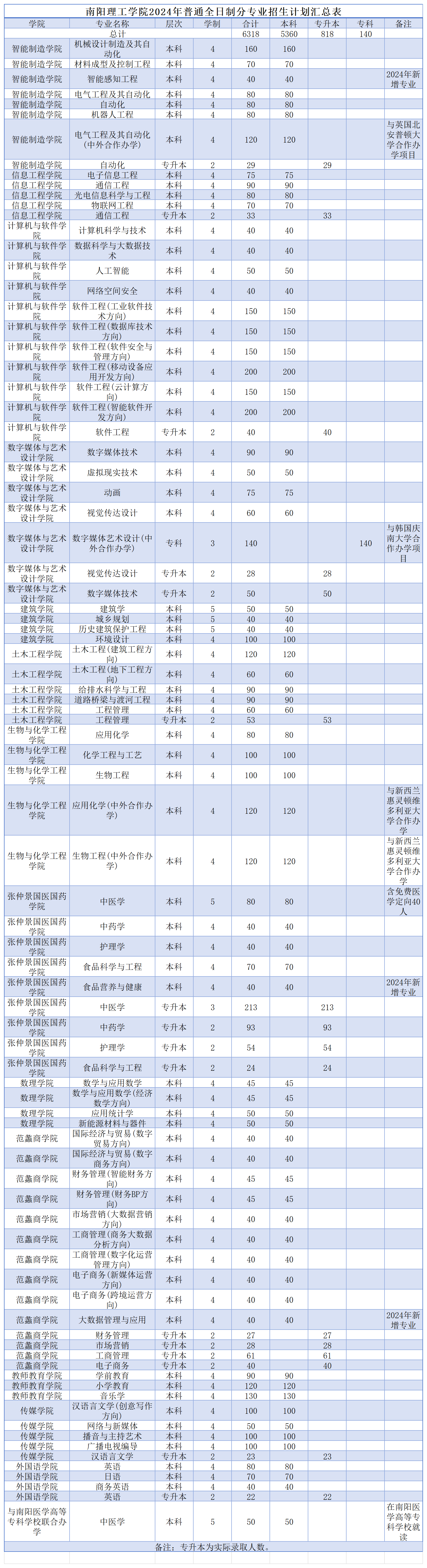 南阳理工学院2024年普通全日制分专业招生计划汇总表