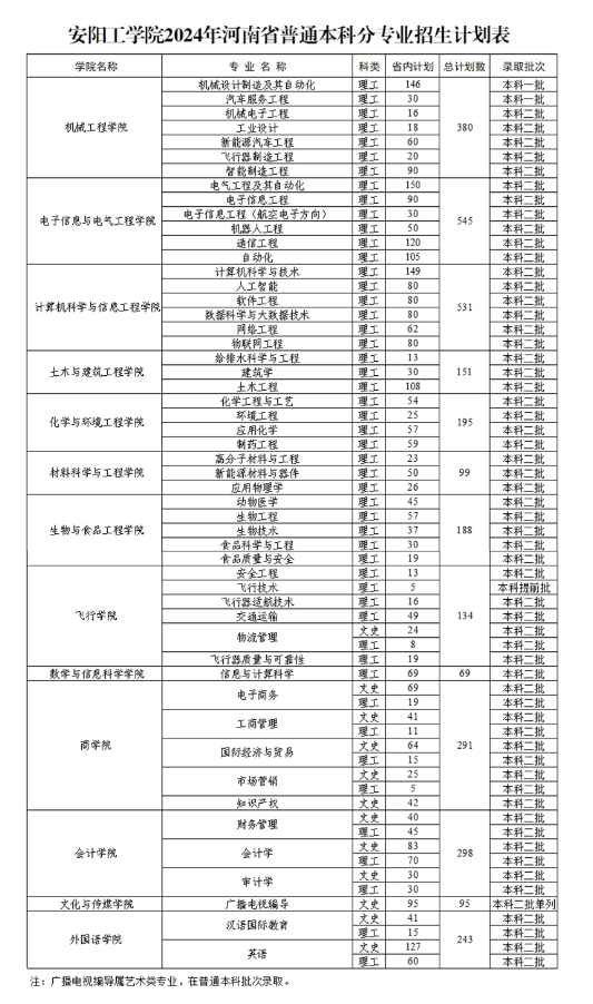 安阳工学院2024年河南省普通本科分专业招生计划表
