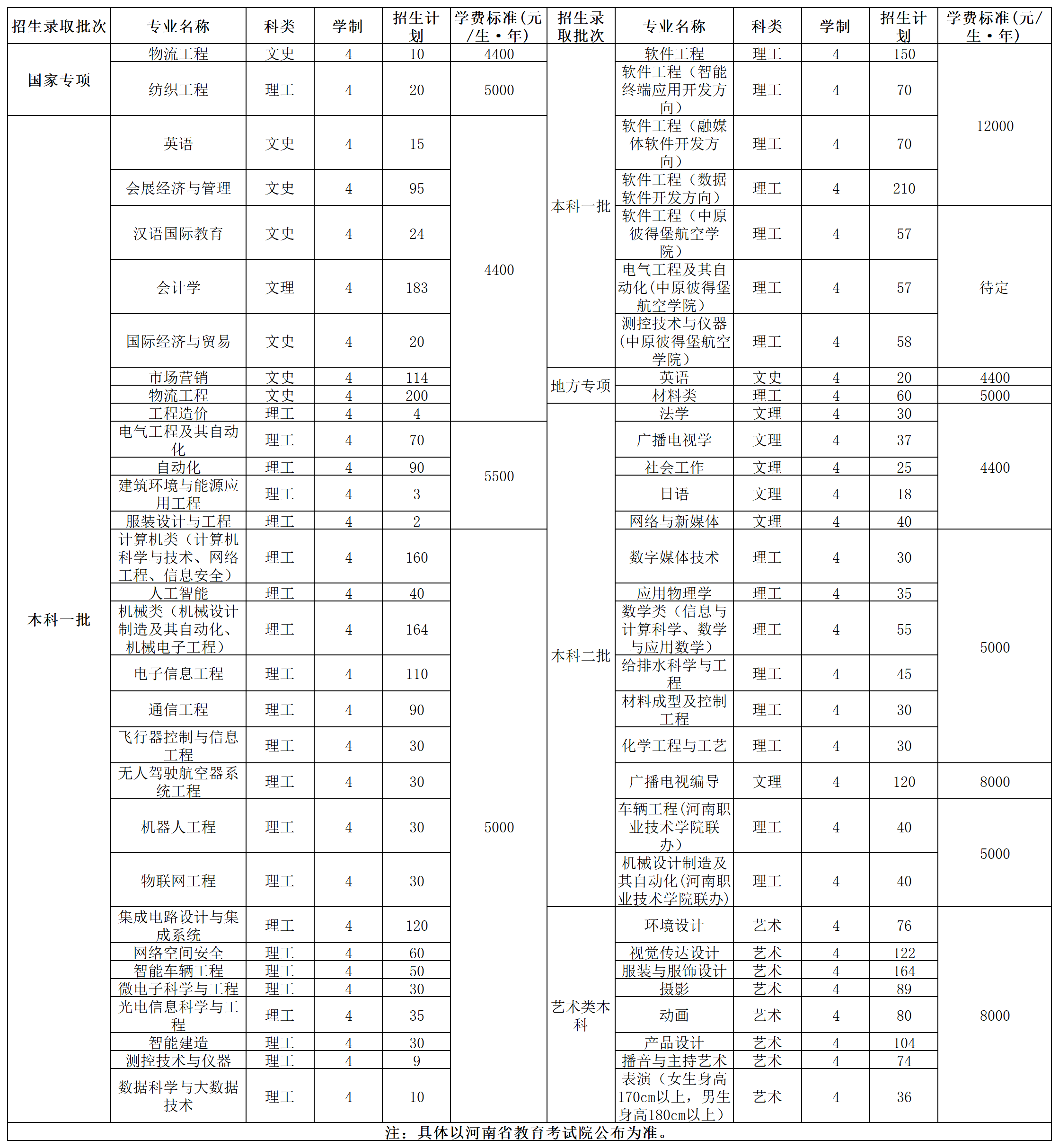 中原工学院2024年河南省招生计划
