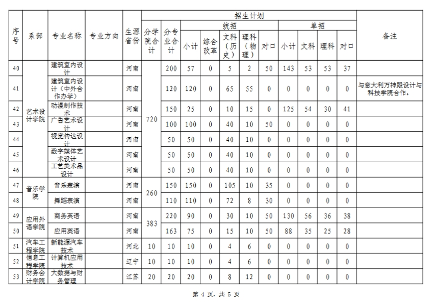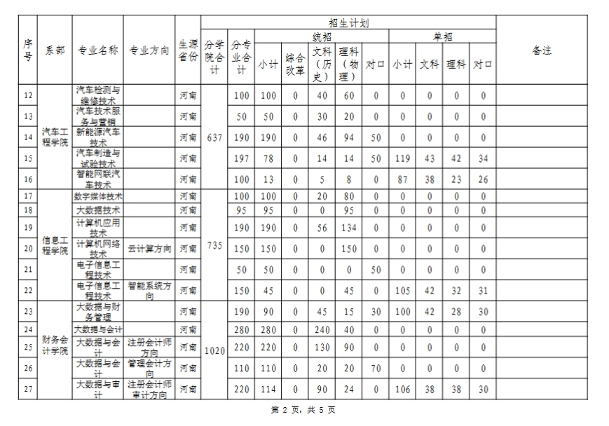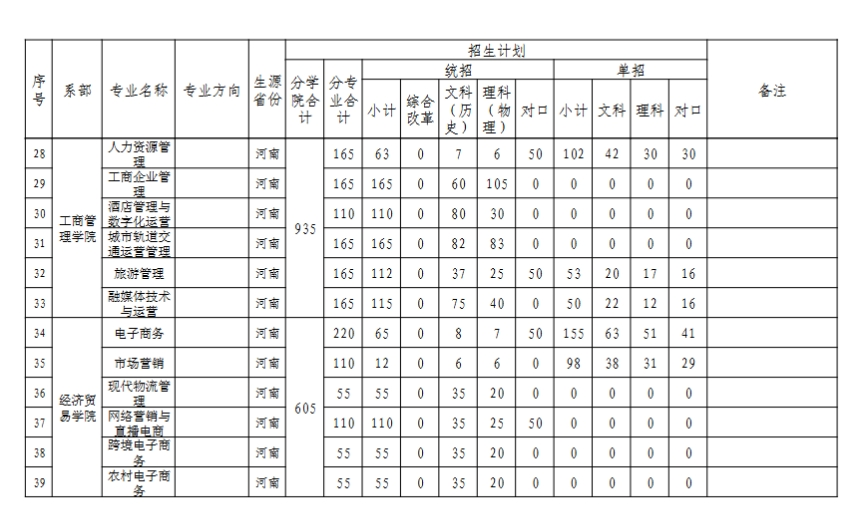 河南工业贸易职业学院2024年高职高专分省分学院分专业招生计划表