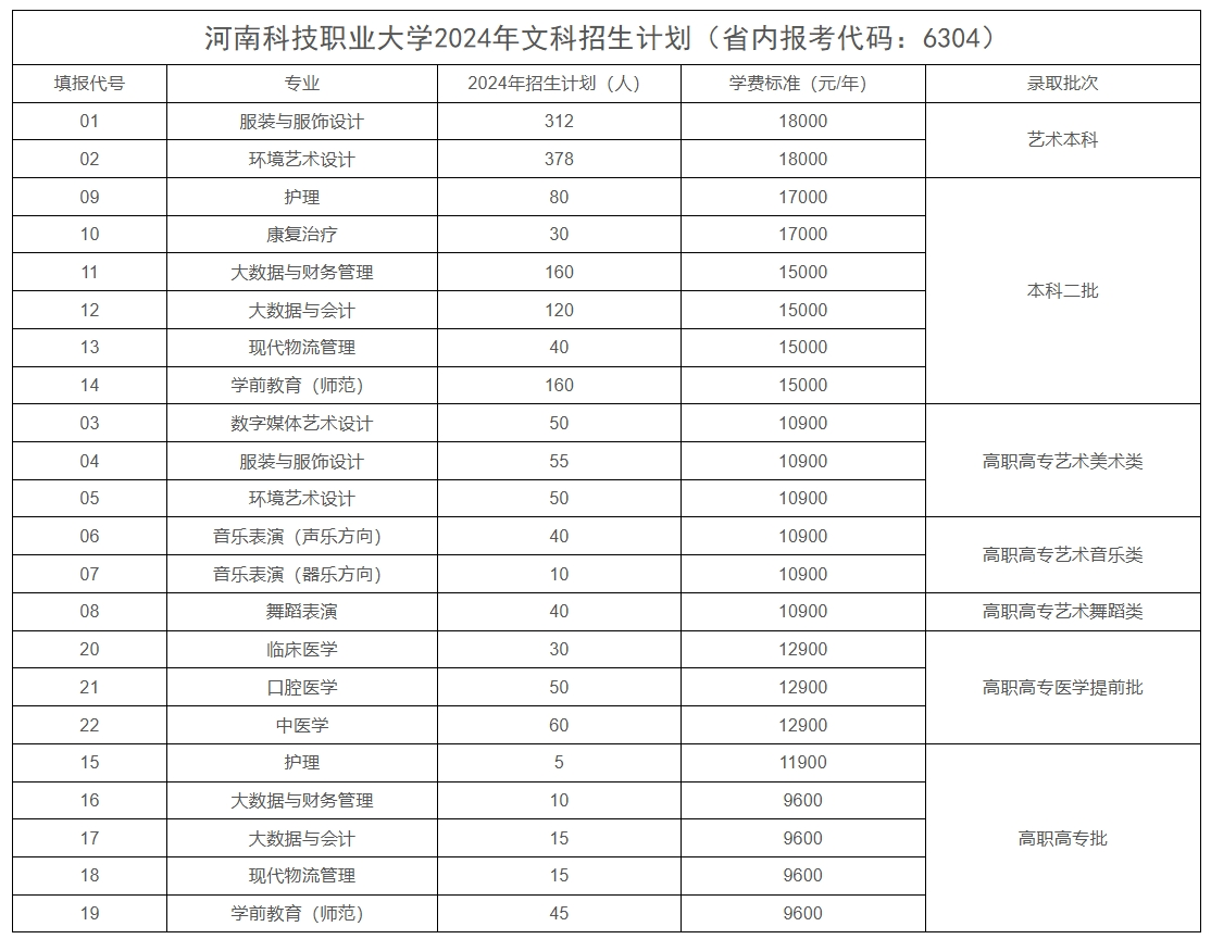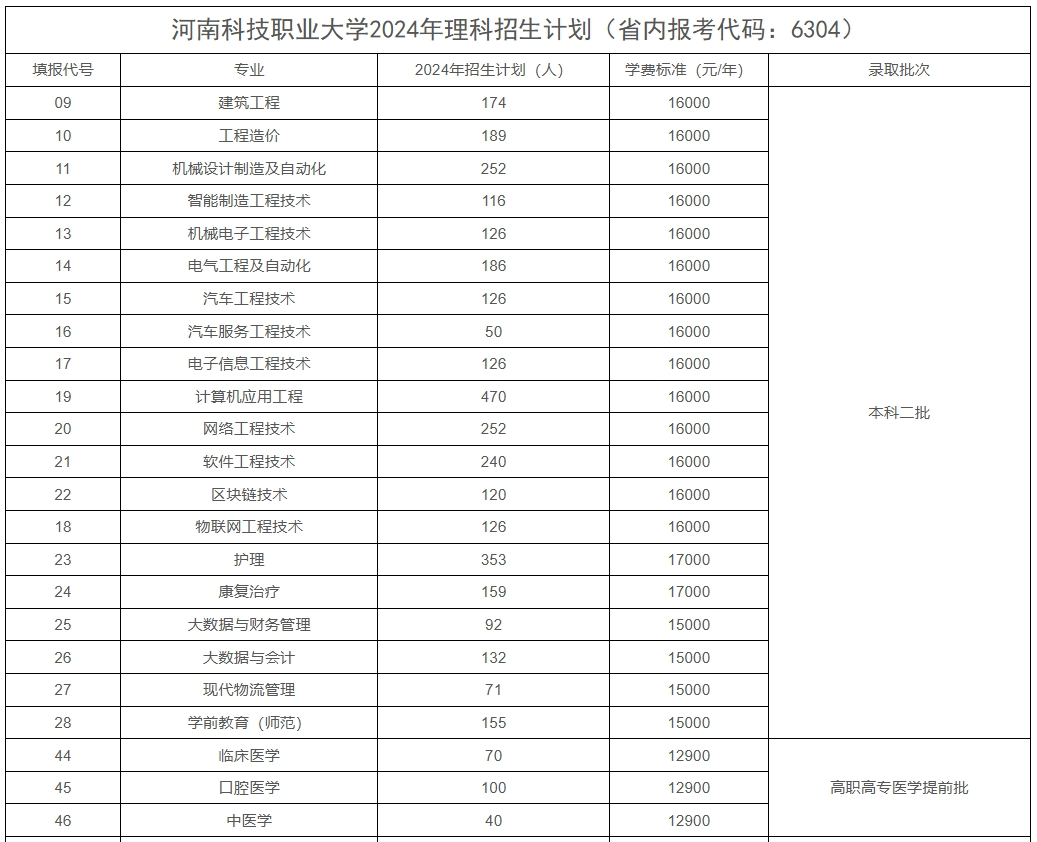 河南科技职业大学2024年本专科分专业招生计划