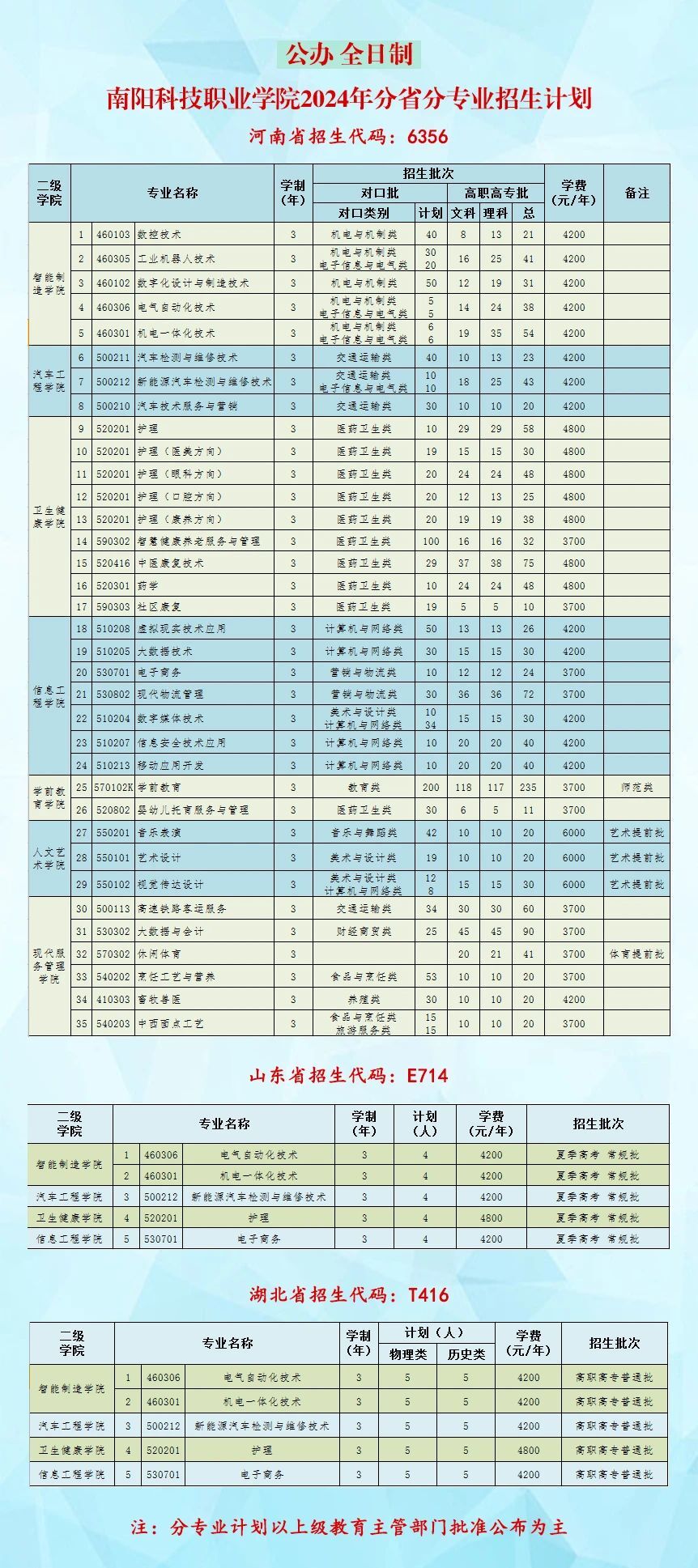 南阳科技职业学院2024年分省分专业招生计划一览表