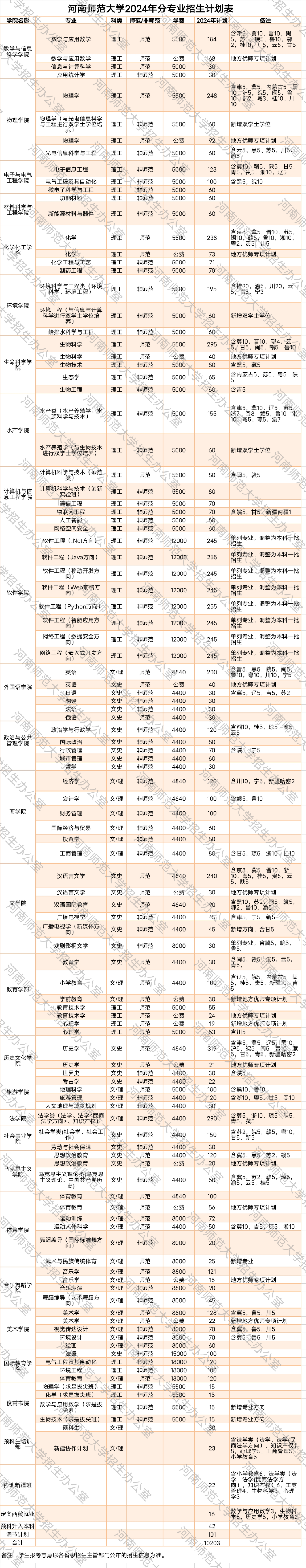 河南师范大学2024年分专业招生计划表