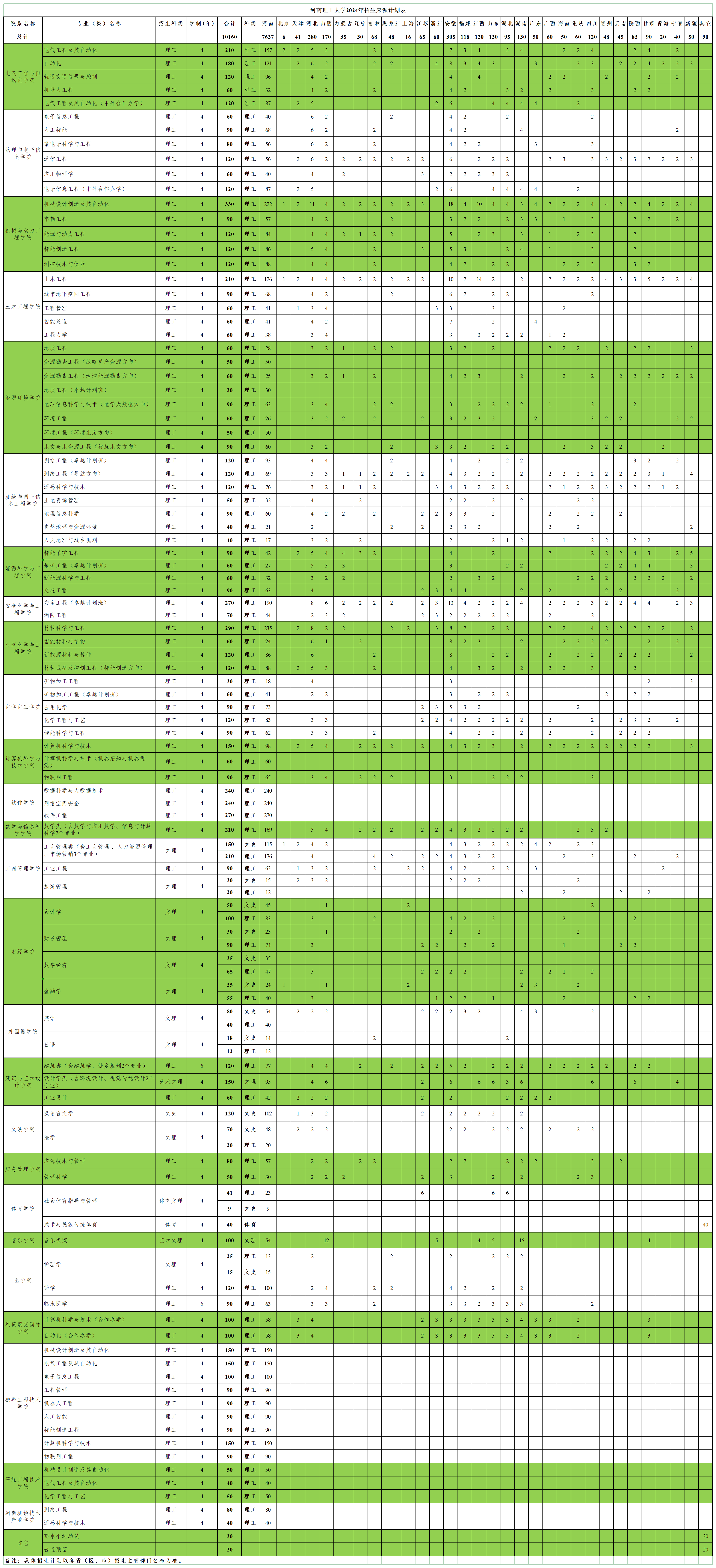 河南理工大学2024年招生来源计划