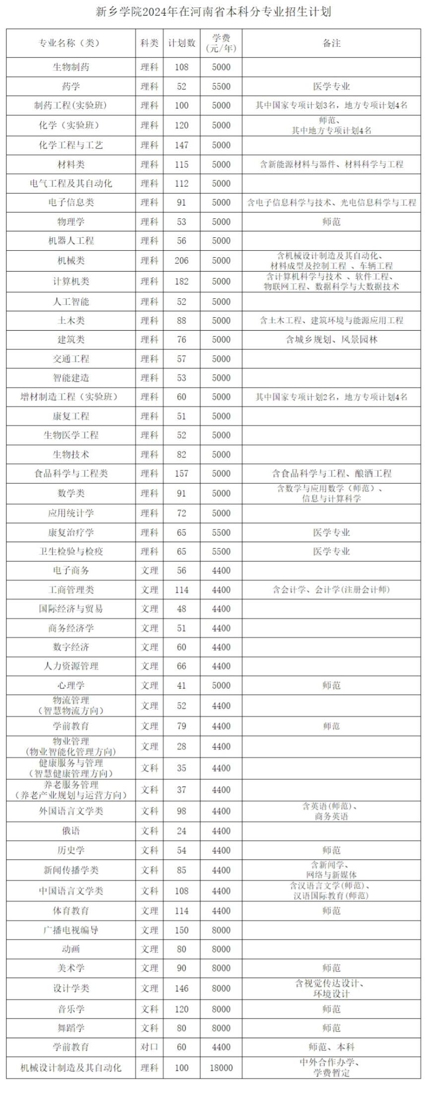 新乡学院2024年招生计划