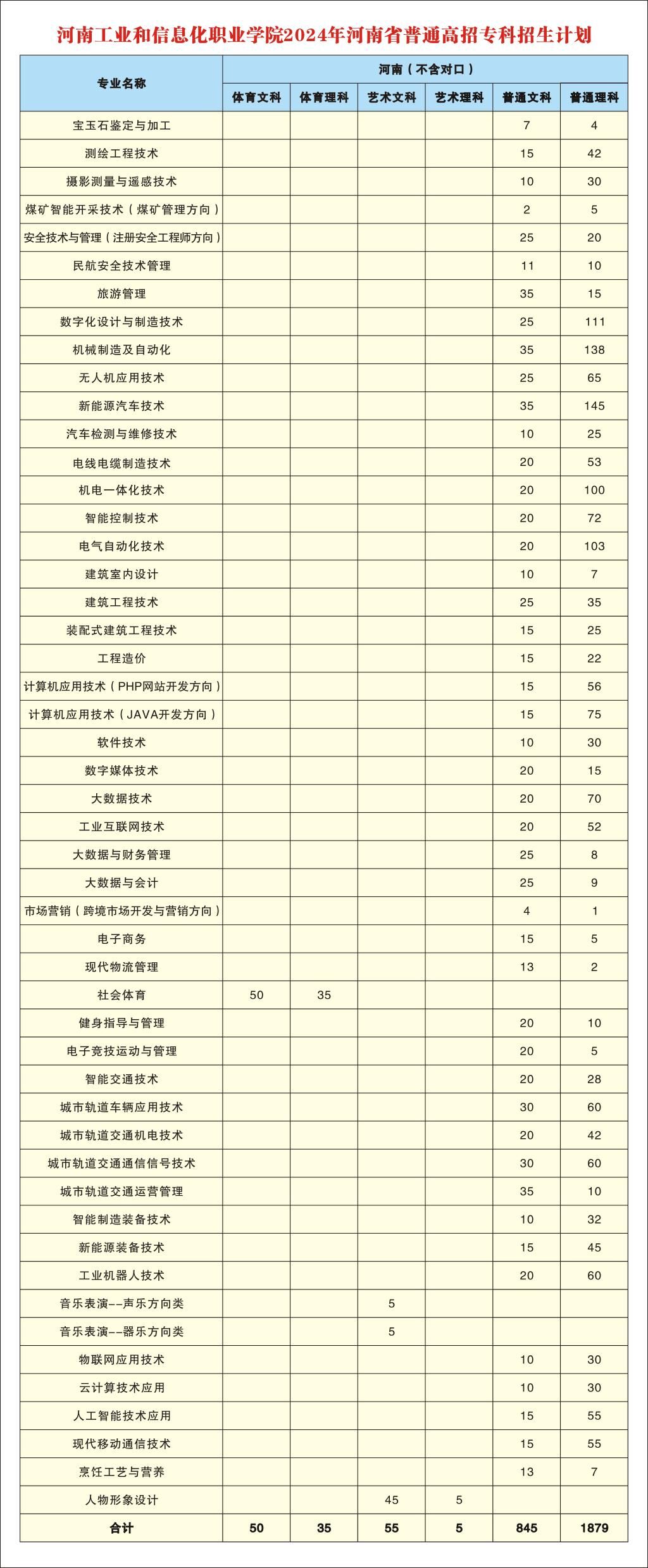 河南工业和信息化职业学院2024年普通高招专科招生计划