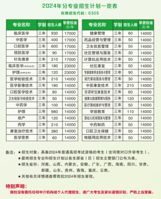 郑州澍青医学高等专科学校2024年分专业招生计划一览表