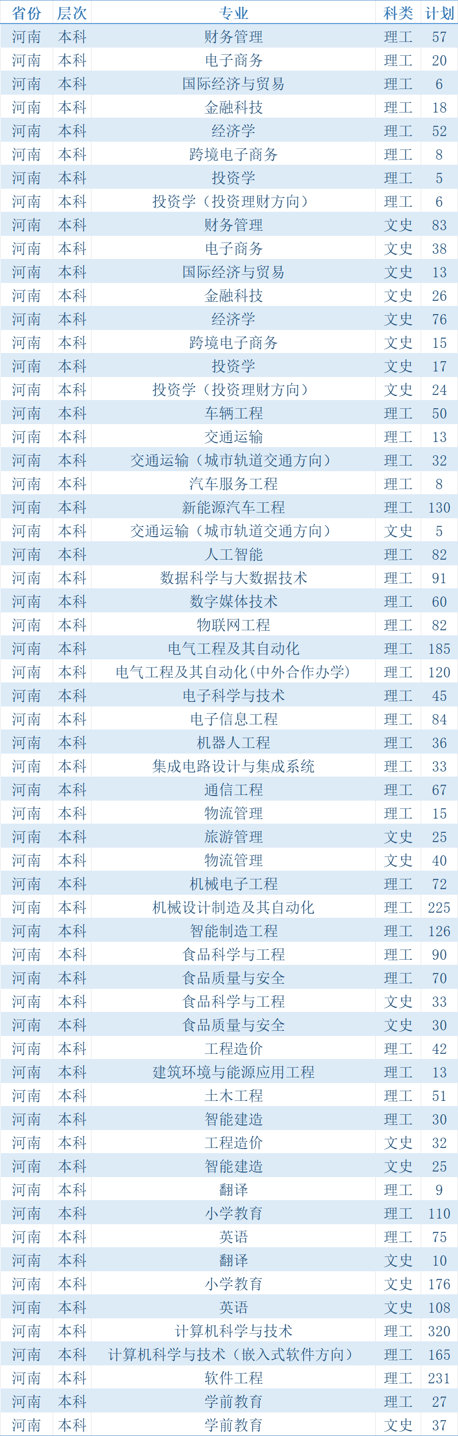 郑州科技学院2024年高招招生计划表