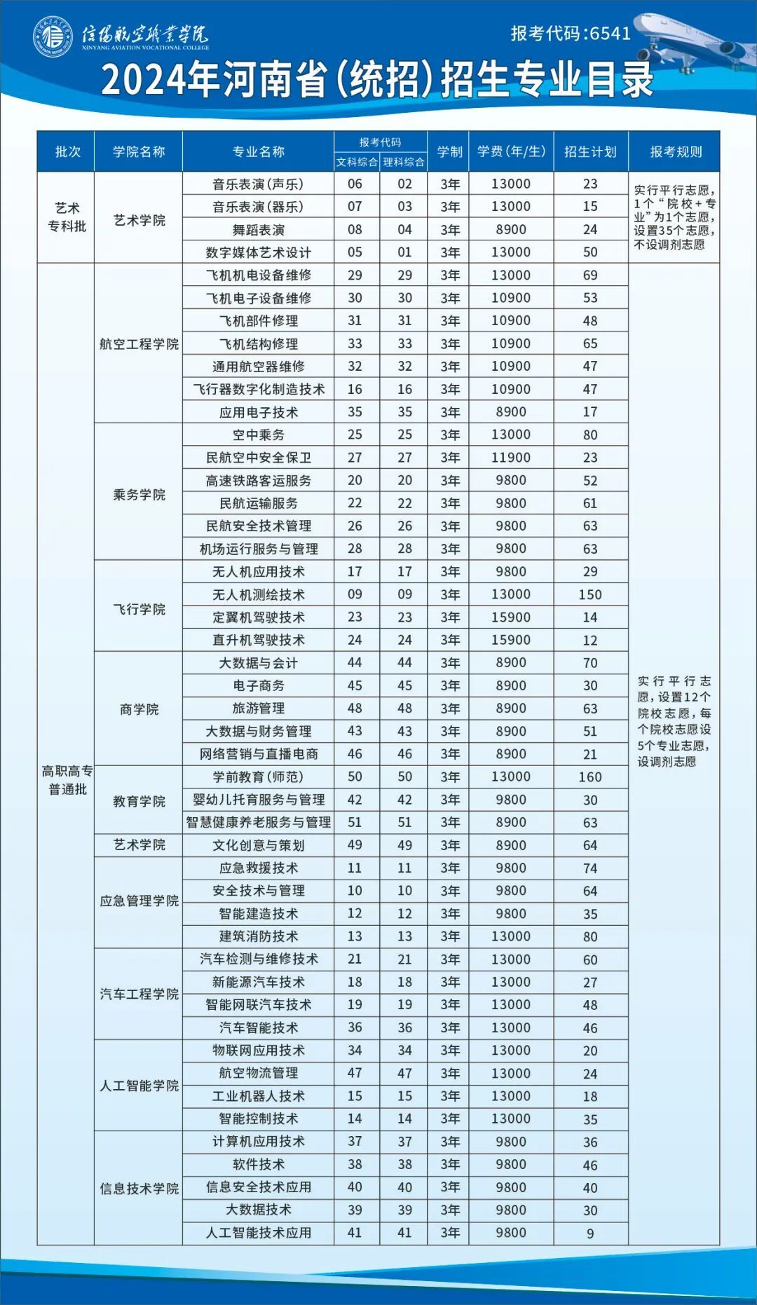 信阳航空职业学院2024年(河南省)统招招生计划
