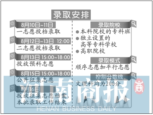 8月10日—11日进行一志愿的投档录取;8月12日—13日12:00进行二志愿的投档录取;8月13日15:00—18:00投放预科志愿。8月15日8:00—18:00对本批计划余额公开征集志愿,8月16日投放征集志愿档案,本批录取工作结束。