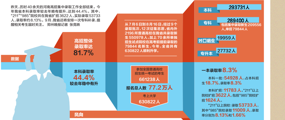 昨天,历时40余天的河南高招集中录取工作全部结束。今年我省本科录取率较去年略有提升,达到44.4%。其中,“211”“985”院校共在我省扩招3622人,实际录取53733人,录取率约8.13%。9月,我省还将安排一次专科补录,提醒相关考生届时关注。