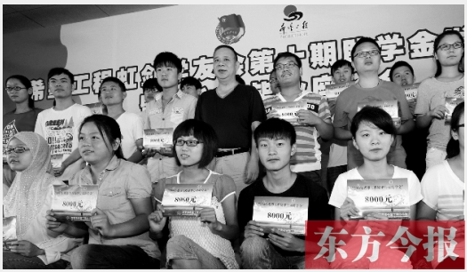 曾经被东方今报报道过的龙凤胎姐弟王琼和王楠,也出现在了助学金发放仪式现场。“我很高兴成为虹剑学友会的一员,感谢李叔,他不仅让我们不再为上大学的费用发愁,更重要的是让我们进入这样一个充满爱心和正能量的大家庭。”姐姐王琼说。