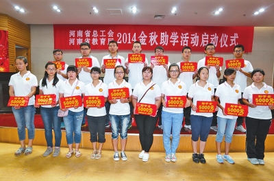 昨日,河南省2014“金秋助学”活动启动仪式在省总工会举行,9316.94万元由省辖市、直管县(市)工会、省各产业工会、省直工会、省总直属工会筹集的助学金,将帮扶全省42694名困难职工子女、农民工子女圆大学梦、考研梦。