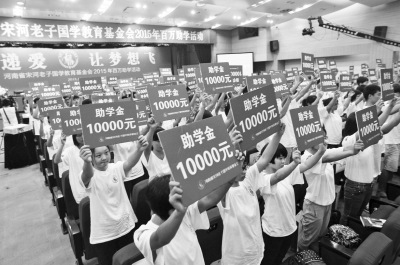 8月16日上午,河南省宋河老子国学教育基金会2015百万助学活动资助仪式在郑州举行。全省202位寒门学子每人收到1万元助学金。这其中,就包括通过大河报筛选并资助的54名特困学子。