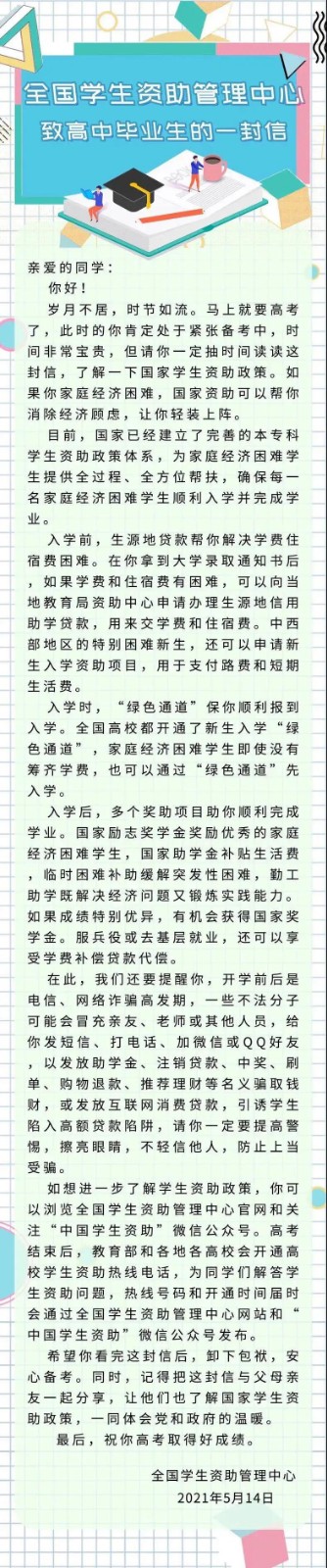 家庭经济困难,升学顾虑怎么破?如何避开网络诈骗?近日,全国学生资助管理中心致信高中、初中毕业生,介绍国家学生资助好政策,提醒防范网络诈骗有关事项,一起来读具体内容